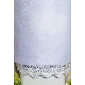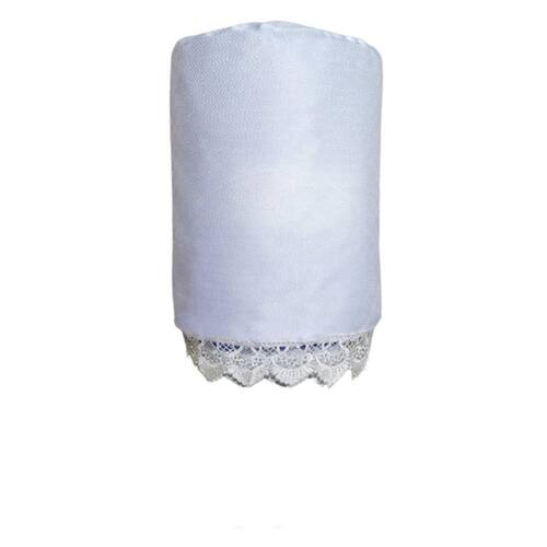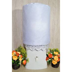 Capa para galão de água confeccionada com tecido oxford liso, 100% poliéster, na cor branca, detalhes no acabamento em guipir na cor branco.