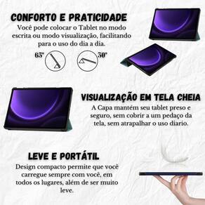 Capa magnética para tablet samsung s9 fe 10.9 x510 + vidro Cor: lavanda Inteligentes para garantir a segurança do seu tablet. Com sua estrutura de silicone resistente e durável, ela é especialmente projetada para proteger seu dispositivo contra quedas acidentais, mantendo-o seguro em qualquer situação. além da proteção robusta, a parte interna da capa é revestida com silicone suave, cuidadosamente selecionados para criar uma barreira protetora, mantendo a tela do seu tablet livre de riscos e quedas. Assim, você pode desfrutar de uma tela impecável e brilhante a qualquer momento. Esta capa é projetada com um slot para caneta que permite fácil acesso e armazenamento de sua caneta. ---------------------------------------- Atenção ---------------------------------------- Compatível com tab s9 fe 10.9 x510 x516/s9 11 x710 x716 ----------------- ----------------- quais são as principais funcionalidades da capa magnética R: a capa magnética possui diversas funcionalidades, incluindo proteção contra quedas, revestimento interno de silicone para proteção da tela contra arranhões e arranhões, além do recurso de auto sleep. esta capa possui espaço para armazenar uma caneta R: sim, esta capa possui um espaço dedicado para armazenar uma caneta. Isso oferece conveniência e praticidade, permitindo ter a caneta sempre à mão para tomar notas rápidas ou assinar documentos sem precisar procurar por ela. como funciona o recurso de auto sleep da capa magnética R: a capa possui um sensor magnético embutido que, ao ser fechado, coloca automaticamente o tablet em modo de suspensão, economizando energia e prolongando a vida útil da bateria. Ao abrir a capa, o tablet retorna instantaneamente ao estado de funcionamento normal. posso usar a capa com película A capa não levanta a película R: sim, é possível usar a capa com a película. A capa possui recortes precisos ao qual não levanta a película ------------------ Especificações ------------------ Material: tpu Material interno: microfibras Compatível com tab s9 fe 10.9 x510 x516/s9 11 x710 x716 ------------------ Conteúdo ------------------ 1x capa magnética. 1x pelicula vidro. Anúncio referente a capa Tablet e caneta não incluso ------------------ Apresentação: ------------------ - qualidade garantida. - atendimento qualificado. - enviamos para todo o brasil. - compra garantida. - despachamos em até 1 dia útil após confirmação do pagamento Garantimos a devolução por arrependimento em até 7 dias, após o recebimento e de 15 dias contra defeitos de fabricação. Marca: Não Informado