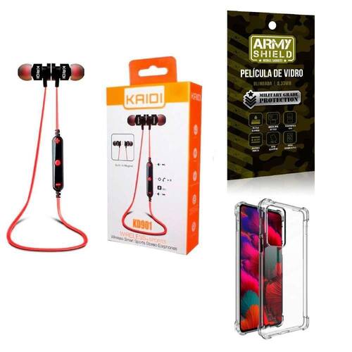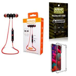 Fone de Ouvido Esportivo sem fio KD-901 Se você procura um fone para as atividades diárias, exercícios e movimento o fone sem fio KD-901 é a escolha ideal Contém Tons graves , profundos e complexos. Um verdadeiro som de qualidade Controle a reprodução de músicas e vídeos direto do botão de controle. Atenda e desligue chamadas, microfone HD in line embutido com controle de faixas. Com imã embutido que não atrapalha e não fica caindo da orelha, produto de design intra-auricular projetado para ser confortável ao ouvido. Isolamento de ruídos sem vazamento de som. O fone utiliza uma tecnologia aeronáutica de redução de ruído. Isola interferência de ruído externo. Mergulhe no mundo da música Especificação Versão: V4.2 Tempo de espera: 200h Tempo de conversação: 6h Tempo de reprodução de música: 4h Tempo de carregamento: 1.5h Faixa de frequência: 2.402G-2.480G Temperatura ambiente: -20/ +60C Distância de transmissão: 10m Especificação do Driver Unidade do driver: 10mm Sensibilidade: 103dB +-3dB Impedância: 16 +- 15% Resposta de frequência: 20-20000Hz Comprimento do cabo: 600mm Conteúdo da Embalagem: 1und - Fone de Ouvido Esportivo sem fio com microfone HD Atenção: Não acompanha itens não descritos neste anúncio. ------------- Capinha Silicone Anti Impacto Anti Shock Transparente - Armyshield A capa de celular antishock é um produto de alta qualidade que oferece proteção e estilo para o seu dispositivo móvel. Feita de material de TPU poliuretano termoplástico de alta resistência, a capa é projetada para absorver impactos e proteger o seu celular contra quedas, arranhões e outros danos. A capa antishock transparente é especialmente projetada para se encaixar perfeitamente no seu celular, proporcionando uma cobertura completa e proteção para todas as partes do dispositivo. Ela é transparente, permitindo que você exiba a beleza do seu celular sem comprometer a proteção. ------------- Película de Vidro 3D Blindada - Armyshield A película de vidro 3D para celular é um produto de alta qualidade que oferece proteção e estilo para o seu dispositivo móvel. Feita de vidro temperado de alta resistência, a película é projetada para se encaixar perfeitamente na tela do seu celular, proporcionando uma cobertura completa e proteção contra arranhões, rachaduras e outros danos. A película de vidro 3D é especialmente projetada para se curvar suavemente ao redor das bordas do seu celular, criando uma aparência elegante e sem bordas. Isso significa que você pode desfrutar de uma experiência de visualização imersiva e sem interrupções, sem se preocupar com a película descolando ou interferindo na sensibilidade da tela. Atenção: O produto acompanha apenas o que apresenta na imagem.
