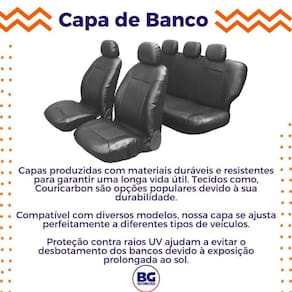 Características: -capas produzidas com materiais duráveis e resistentes para garantir uma longa vida útil. Tecidos como, Couricarbon são opções populares devido à sua durabilidade. -protege e conserva os bancos. -compatível com diversos modelos, essa capa se ajusta perfeitamente a diferentes tipos de veículos. -instalação rápida. -proteção contra os raios UV ajudam a evitar o desbotamento dos bancos devido à exposição prolongada do sol.