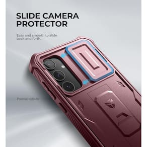 Proteção contra impactos de nível militar com design de dupla camada e cantos reforçados. Tampa deslizante embutida para câmera com design à prova de poeira e travas de privacidade. Inclui duas molduras frontais: uma com protetor de tela embutido e outra sem. Suporte dobrável para visualização sem usar as mãos e pegada segura com uma mão. Recortes precisos para fácil acesso a todos os botões, portas e funções da câmera.Tipo