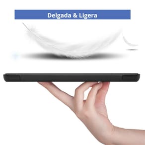 Estojo de couro sintético e plástico. Tampa de canto reforçada para evitar choques e quebras. A frente é dura e tem ímãs para evitar aberturas durante o transporte. Tem a função de tela de dormir/acordar ao abrir ou fechar o estojo. Graças ao design da capa, desfrutamos de uma exibição completa da tela, pois ela permanece completamente nítida quando é fixada nas bordas do tablet. O interior da capa é de camurça para evitar arranhões quando o tablet está dentro da capa. O design do estojo é específico para o modelo e, graças a isso, você pode fazer uso normal de botões, portas e câmeras.