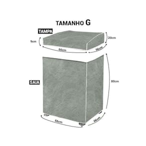 Material: Laminada de PVC e Poliéster Tamanho: G Tampa: 0,66m Largura x 0,09m A frente x 0,20m A trás x 0,66m Profundidade Saia: 0,66m Largura x 0,80m Altura x 0,66m Profundidade Peso: Aproximadamente 250g