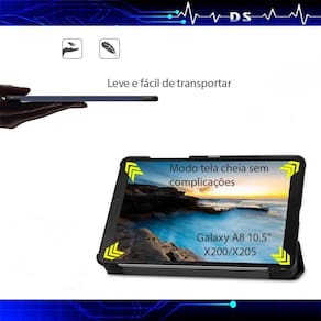 Capa case para galaxy tab a8 x200 x205 + película de vidroEficiênciaA capa possui encaixes perfeitos para mexer no seu tablet para samsung galaxyLeve e modernaSeu exterior é feita em alta qualidadeUm modelo super bacana para você levar onde quiser. Até mesmo na sua bolsaA capa oferece máxima proteção ao seu aparelhoDesenvolvida com materiais modernos e elegantesEspecificações da capaCompatível apenas com os modelos: sm- x200 / x205Abertura para carregador, câmera, fone de ouvido e botõesPerfeita para usar como estação de trabalhoProtege o tablet contra impactos e riscos imagem ilustrativa no anúncio