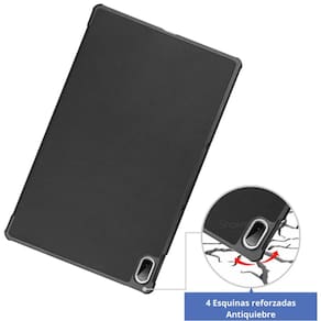 Estojo de couro sintético e plástico. Tampa de canto reforçada para evitar choques e quebras. A frente é dura e tem ímãs para evitar aberturas durante o transporte. Tem a função de tela de dormir/acordar ao abrir ou fechar o estojo. Graças ao design da capa, desfrutamos de uma exibição completa da tela, pois ela permanece completamente nítida quando é fixada nas bordas do tablet. O interior da capa é de camurça para evitar arranhões quando o tablet está dentro da capa. O design do estojo é específico para o modelo e, graças a isso, você pode fazer uso normal de botões, portas e câmeras.