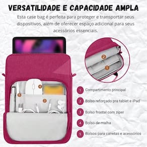 Capa pasta bolsa com alça para lenovo tab m11 11 polegadas Cores: cinza Nossa bolsa é completa para proteger e transportar seus tablets e ipads de até 11 polegadas. Com um compartimento principal espaçoso, um bolso frontal com zíper e um bolso de malha, você terá espaço de sobra para todos os seus acessórios essenciais. Além disso, um bolso reforçado especialmente projetado para seu tablet ou garante que seus dispositivos estejam sempre seguros. imagine a conveniência de carregar seu dispositivo com total conforto graças à alça regulável que oferece múltiplas opções de transporte. Seja para o trabalho, estudo ou lazer, essa bag se adapta às suas necessidades diárias. fabricada com materiais de alta qualidade, ela é resistente à água e possui um zíper robusto que proporciona um fechamento seguro, mantendo seu tablet ou protegido em qualquer situação. não perca a chance de adquirir esta bag versátil e de alta capacidade. Compatível com uma ampla variedade de tablets e ipads de até 11 polegadas, ela é a escolha ideal para quem busca praticidade e proteção premium. ------------------ ------------------ quais dispositivos são compatíveis com esta case bag R: a case bag é compatível com uma ampla variedade de tablets e ipads de até 11 polegadas. a alça da case bag é ajustável R: sim, a case bag possui uma alça regulável que oferece múltiplas opções de transporte, permitindo que você a use de diversas formas para maior conforto e praticidade no seu dia a dia. esta case bag é adequada para viagens R: sim, com sua construção resistente, proteção contra água e alça regulável, esta case bag é perfeita para viagens, proporcionando segurança e conveniência para transportar seus dispositivos e acessórios. quais compartimentos e bolsos estão incluídos na case bag R: a case bag inclui um compartimento principal espaçoso, um bolso reforçado para tablet ou , um bolso frontal com zíper, um bolso de malha e bolsos específicos para canetas e acessórios. ------------------ Especificações ------------------ Altura: 28 cm. Largura: 23 cm. Alça regulável Compatível com uma ampla variedade de tablets e ipads de até 11 polegadas. ------------------ Conteúdo ------------------ 1x bolsa universal. Anúncio referente a bolsa Acessórios que ambientam as fotos não inclusos. ------------------ Apresentação: ------------------ - qualidade garantida. - atendimento qualificado. - enviamos para todo o brasil. - compra garantida. - despachamos em até 1 dia útil após confirmação do pagamento Garantimos a devolução por arrependimento em até 7 dias, após o recebimento e de 15 dias contra defeitos de fabricação.