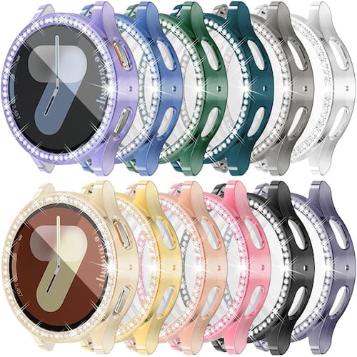- ?Pacote com 12 e pedra rinestona?A caixa do relógio vem com 12 cores vibrantes. Ouro / ouro pálido / ouro rosa / lilás / rosa / azul / verde / verde esmeralda / cinza névoa / prata / cinza / preto. Conjunto de capas Richone Samsung Watch 7 com um anel de strass brilhante, protegendo seu relógio e adicionando um pouco de interesse estético às suas roupas diárias. Fácil de combinar com várias pulseiras de relógio, combine com seu vestido e capa de telefone, qualquer roupa ou unhas facilmente.