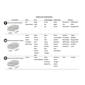 Fixação: Elástico resistente nas extremidades e cinta para envolver o veículo;