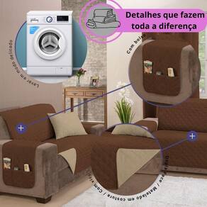 Capa Protetora de Sofá King 3 Lugares Manu Matelado Dupla Face Variação: Cáqui e Marrom Protetor de Sofá Manu 3 Lugares King - Dupla Face, Estilo Matelado com Bolsos Laterais Renove a decoração da sua sala com o Protetor de Sofá Manu 3 Lugares King, um modelo elegante e funcional, perfeito para quem busca proteção, estilo e praticidade no dia a dia. Com design reversível e acabamento matelado em losangos, ele é a combinação ideal de versatilidade e sofisticação. Dupla Face - 2 Cores em 1 Produto Transforme o ambiente sempre que desejar A capa de sofá Manu é reversível, com cores distintas em cada lado, permitindo que você altere o visual da sua sala de forma rápida e prática. Design Matelado Elegante Com costuras em linha que formam desenhos de losangos, o protetor traz um visual moderno e requintado, elevando o estilo do seu estofado. Bolsos Laterais Funcionais Porta-Objetos Conta com bolsos estrategicamente posicionados em um dos braços, ideais para armazenar controles, livros, revistas ou pequenos itens do dia a dia. Os bolsos permanecem funcionais em qualquer lado da capa. Acabamento com Viés - Mais Durabilidade e Estilo O acabamento reforçado com viés nas bordas garante um toque de elegância e maior resistência ao uso contínuo. Medidas Aproximadas Largura x Altura : Capa Principal: 1,80 m x 1,90 m Braços costurados à capa : 0,40 m x 0,80 m cada Medida total com braços: 3,40 m x 1,90 m Importante: Meça a largura do assento do seu sofá de braço a braço, sem incluir os braços para garantir o encaixe ideal. Composição do Material: Tecido Superior e Inferior: 100% Poliéster Manta Interna: 100% Poliéster Características: dupla Face reversível com Bolsos porta-objetos acabamento com Viés matelado em Linha lavável em Máquina modo delicado Informações Importantes: Os bolsos estão presentes em apenas um dos braços, variando entre o lado direito ou esquerdo conforme o lote. As cores podem sofrer variações de tonalidade devido à iluminação da foto e ao monitor. A imagem pode ilustrar outro tamanho do produto - verifique sempre as medidas na descrição. Conteúdo da Embalagem: 1 Protetor de Sofá Manu 3 Lugares King com Bolsos : contra defeitos de fabricação. Marca: Não Informado