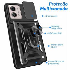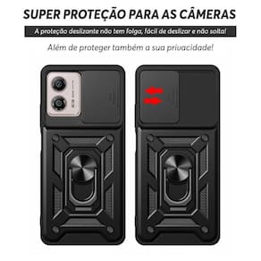 Características: - Alta proteção - Ótimo acabamento com alto relevo na parte que protege a câmera - Dupla resistência - proteção anti impacto de dupla camada - Multi-funções - anel de dedo e metal embutido para aderir em imã - Base - anel ajustável para função de base - Encaixe 100% perfeito - Slide cover para maior proteção das câmeras e maior privacidade - Compatível apenas com Motorola Moto G73