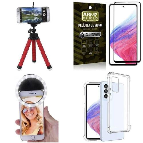 Kit mini tripé + selfie ring light + capa anti impacto + película vidro 3d