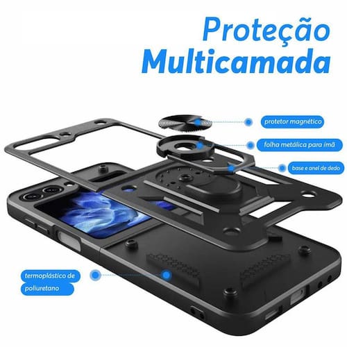 Com a Capa Case Capinha Samsung Galaxy Z Flip 5 Protetora Militar, você terá a tranquilidade de saber que o seu smartphone está protegido, graças à sua construção de dupla camada que oferece uma proteção anti impacto eficaz. Além disso, o ótimo acabamento com alto relevo na parte que protege a câmera garante uma proteção extra para a lente.
