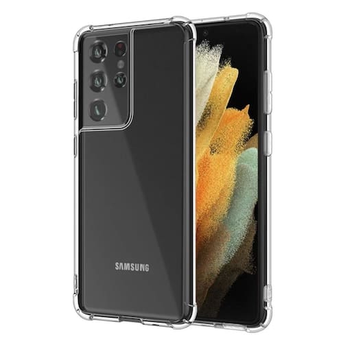 CapaO pacote inclui:\ n1 x capa de silicone flexível transparente com borda reforçada (à prova de choque) para Samsung S21 Ultra 6,7 polegadas\ nCapa de silicone transparente com bordas reforçadas\ nPerfeita para proteger seu celular de futuras quedas ou arranhões na parte traseira. * O produto não inclui telefone