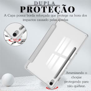 A capa possui um slot para caneta, permitindo um fácil acesso e armazenamento seguro da sua caneta. Além disso, a textura de silicone na parte externa da capa proporciona uma aderência confortável e segura, evitando que o tablet escorregue das mãos enquanto está carregando. A parte traseira de acrílico dessa capa não amarela, mantendo a aparência elegante do seu dispositivo por mais tempo.