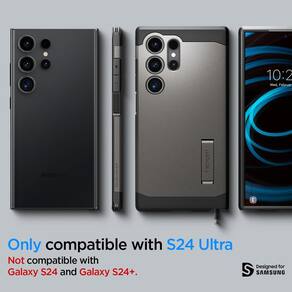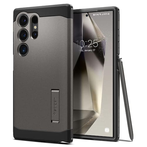 Spigen Capa Tough Armor projetada para Galaxy S24 Ultra (2024) [Suporte] [Proteção de nível militar] - Gunmetal - Feita de PC, TPU e espuma de impacto para maior durabilidade - Proteção de nível militar via tecnologia de proteção extrema - Suporte integrado para visualização sem usar as mãos - Bordas elevadas para proteção de tela e câmera - Compatível com S Pen, carregamento sem fio e PowerShare