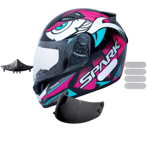 - 1 Capacete Ebf Spark Dragon Preto Rosa - 1 Narigueira Alta Big Universal - 1 Viseira Capacete EBF E0X Spark 2mm Polivisor Fumê - 1 Adesivo Refletivo Branco