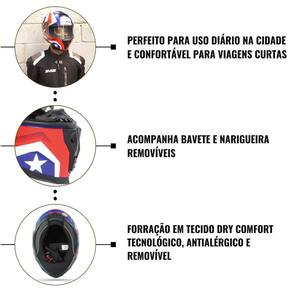 Com um design vibrante em branco, vermelho e azul, ele combina proteção certificada com o selo NBR 7471 do Inmetro e funcionalidade para pilotagem urbana, tornando-se a peça ideal para quem não quer escolher entre segurança e personalidade.
