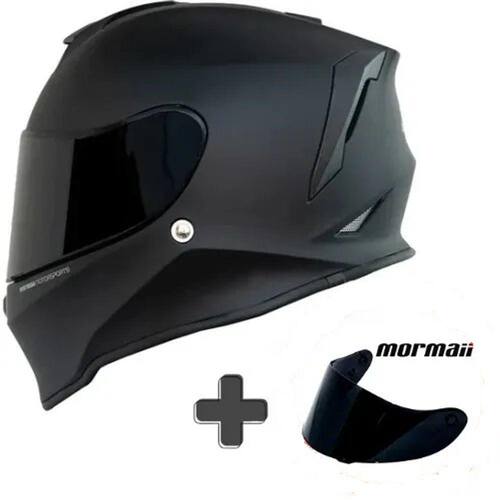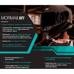 SOBRE O PRODUTOO PRODUTO ACOMPANHA O CAPACETE M1 PRETO FOSCO COM VISEIRA CRISTAL + VISEIRA FUMÊOBS.: CASO DESEJE SUBSTITUIR A VISEIRA FUMÊ PELA VISEIRA ESPELHADA OU CAMALEÃO MANDE-NOS UMA MENSAGEM IMEDIATAMENTE APÓS A COMPRA E ANTES DO DESPACHO DO PRODUTO.O novo capacete MORMAII M1 foi projetado e desenvolvido dentro de padrões internacionais de segurança e desempenho. Seu casco é construído em material muito leve e resistente, com design moderno e aerodinâmico. A união de performance, segurança e conforto tornam o M1 um produto diferenciado, que irá combinar com seu estilo.ESPECIFICAÇÕES DO PRODUTODIVISÃOADULTOGÊNEROUNISSEXCARACTERÍSTICA- Capacete construído em hir-th (high resistance thermoplastic resin), tornando-o leve e com alta resistência a impactos- Casco exclusivo com design moderno e aerodinâmico- Sistema de ventilação de alta performance, com duas entradas de ar frontais e cinco saídas traseiras, melhorando o fluxo de ar- Eps de múltiplas densidades para otimizar a proteção do piloto- Sistema de retenção reforçado para máxima segurança- Engate micrométrico na cinta jugular- Forro removível, lavável, hipoalérgico e confortável- Encaixe ergonômico para óculos- Viseira flat 2mm com tratamento anti-risco, amplo campo de visão e menor distorção óptica- Sistema de troca rápido de viseirasProduto NOVO na CAIXA ORIGINAL Importado.