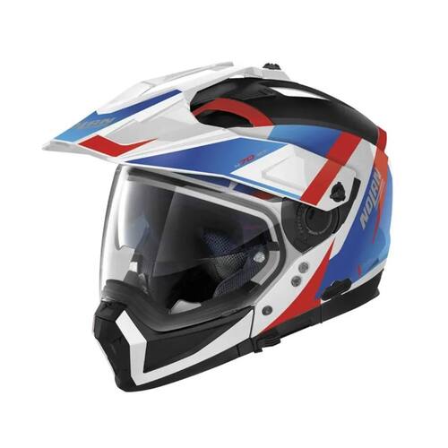 Capacete Nolan N70-2x Skyfall N-com Branco Vermelho Azul 60   100% Italiano, N70-2 X é o modelo mais versátil da marca italiana Nolan. Essa versatilidade é exibida nas oito configurações possíveis utilizando a queixeira, viseira e pala removíveis. Este capacete irá surpreender você que pilota tanto no asfalto, quanto na terra. Vale lembrar que esse Nolan foi o primeiro capacete de moto do mercado equipado com a proteção de queixo removível, permitindo ser um capacete aberto e fechado, ou seja, dois em um. Assim, você pode andar com um estilo off-road completo ou um estilo de pilotagem mais suave. O N70-2 possui uma viseira ultra-larga que proporciona um campo de visão mais amplo.   •Protetor de Queixo Removível •Acompanha Pinlock •Campo de visão amplo Características:   Calota do capacete: A calota do Nolan N70-2 X foi desenvolvida para atender aqueles que não dispensam proteção, porém investem em estilo e perfeição. A composição é de Policarbonato LEXAN, um polímero de alta qualidade quando se trata de eficiência de impacto. É importante destacar que o Policarbonato LEXAN é mais eficaz e rígido do que o ABS utilizado em algumas marcas de capacete.   Este modelo possui dois tamanhos de calota, o S (55-56) e M (57-58), e o L (59-60) e XL (61-62), porém o tamanho do EPS (isopor que absorve o impacto) altera de acordo com cada tamanho elevando a segurança do casco.   Sistema de segurança:   O Nolan N70-2 X é equipado com um sistema de segurança Microlock 2 (engate rápido), o qual possui dupla alavanca e ajuste micrométrico. Esse sistema é produzido com material termoplástico para a alavanca de abertura ergonômica e alumínio para a alavanca dentada e vedante. Uma alavanca só abre após a outra ser liberada, isso reduz a possibilidade de abertura involuntária.   Esse produto é homologado para ser utilizado tanto com a queixeira, quanto sem a queixeira. Ou seja, ele foi aprovado para ser um capacete integral e aberto.   Viseira: Uma das principais características desse modelo é o amplo campo de visão da viseira. Essa viseira possibilita uma visão maior na parte frontal e lateral, garantindo assim o máximo conforto e segurança na pilotagem. A viseira também é resistente a arranhões, dispõe de sete estágios de aberto e possui pinos para a instalação do Pinlock (incluso), película ante embaçante.   Este modelo de capacete idealizado pelo grupo italiano, possui um sistema de ajuste na viseira que permite ajustar com exatidão o Pinlock. Esse sistema atua do lado externo da viseira, não havendo a necessidade de desmontá-la para a instalação do Pinlock.   Visor solar: Visor solar impresso em Policarbonato LEXAN e proteção contra raios ultravioletas de até 400 nanômetros. Além disso, o visor possui tratamento S/R, resistente a arranhões, e F/R, resistente a neblina e manchas. Este visor pode ser facilmente desmontado para casos em que não haja necessidade do uso do mesmo, ou que seja preciso a lavagem do acessório. O acionamento do óculos solar é realizado através do lado esquerdo e para voltar na posição autêntico basta apertar o botão que o visor irá retornar automaticamente.   Conforto/Forração: O interior do Nolan N70-2 X foi confeccionado por um sistema de conforto recém-concebido. Desenvolvido por micro perfurados de micro densidades e combinado com o sistema de ventilação avançado “AirBooster Technology”, promove a difusão do ar na área superior da cabeça do piloto.   A cinta jugular é equipada com duas almofadas para maior conforto na pilotagem. Vale lembrar que essas almofadas são removíveis e laváveis, assim como toda a forração. Esse modelo também possui clips de ajustes na forração, possibilitando a regulagem perfeita no rosto do piloto.   Ventilação: O Nolan N70-2 X conta com um alto sistema de ventilação AirBooster, o qual assegura uma ventilação ideal onde o piloto mais precisa. O ar é retirado das entradas de ar dianteiras e encaminhado até as áreas mais críticas que recebem menos ventilação. Esse sistema de ventilação também consiste em outra entrada de ar na queixeira, a qual ventila a boca direcionando o ar diretamente para a viseira, limitando o embaçamento. Além disso, também possui uma saída de ar integrada ao spoiler traseiro, expulsando o ar quente do capacete.   O que acompanha o Nolan N70-2 X? Esse modelo acompanha Pinlock (película antiembaçante), visor solar interno, viseira cristal e bavete.   O capacete já é preparado e aprovado para uso do sistema de intercomunicador N-Com (vendido separadamente).Contém:1 - Capacete Nolan N70-2X Skyfall Branco/Vermelho/Azul   ***Imagem Ilustrativa***