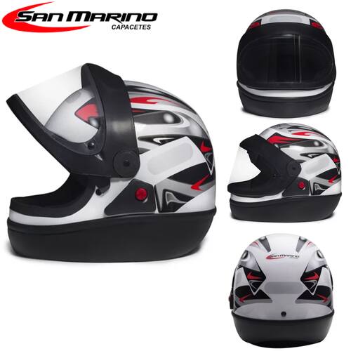Embalagem:   - 1 Capacete San Marino   Especificações Técnicas:     - Marca San Marino - Modelo Grafic - Tamanho 56,58,60,62 - Casco Em ABS Natural - Abertura Automática Da Viseira - Viseira Cristal Em Policarbonato - Sistema Rápido De Troca De Viseiras - Leve - Confortável - Certificado Pelo Inmetro - Resistente a impactos - Ótimo Acabamento - Ótima Qualidade - Selo de provação NBR7471 - Tecido antialérgico; - Engate micrométrico