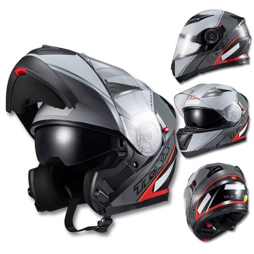 Com frente escamoteável, o capacete TEXX Gladiator V3 possui as viseiras externa e solar interna com acabamento anti-rrisco, anti-embaçamento e com proteção UVA/UVB.