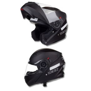 Com frente escamoteável, o capacete TEXX Gladiator V3 possui as viseiras externa e solar interna com acabamento anti-rrisco, anti-embaçamento e com proteção UVA/UVB.