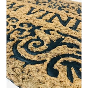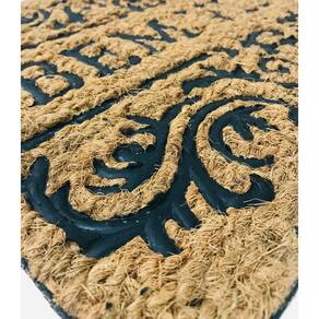 Sua superfície é confeccionada em fibra de coco natural, excelente para reter sujeiras e manter os ambientes internos limpos. O grande diferencial está nas estampas em relevo de borracha, que criam arabescos ornamentais ao redor, agregando charme e elegância ao visual do capacho.