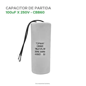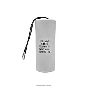 - Modelo: CBB60 - Capacitância: 100uF - Tolerância: 5% - Tensão nominal: 250V AC - Frequência: 50/60Hz - Fios: 2 terminais com isolação - Temperatura de operação: - 40 graus a +85 graus - Aplicações: Motores elétricos, ventiladores e compressores. Marca: Não Informado