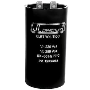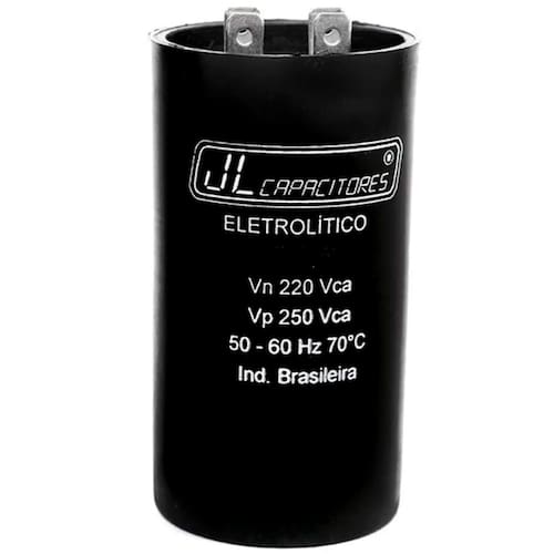 Marca: JL Capacitores Modelo: Eletrolítico Cor: Preto Frequência: 50/60Hz Conector: Tipo Terminal, Duplo ou Simples Capacitância: 378-454UF Voltagem máxima: 127 volts Temperatura mínima de operação: 0° Temperatura máxima de operação: 70°