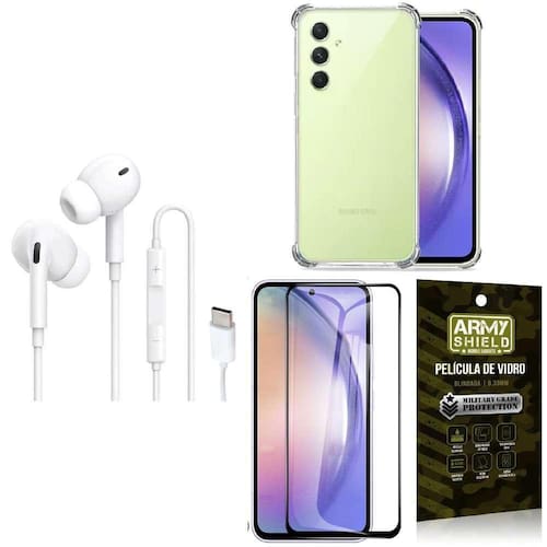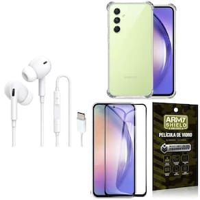 Kit Capinha AntiShock Transparente + Película de Vidro 3D + Fone de ouvido Tipo C Intra-Auricular estéreo com microfone