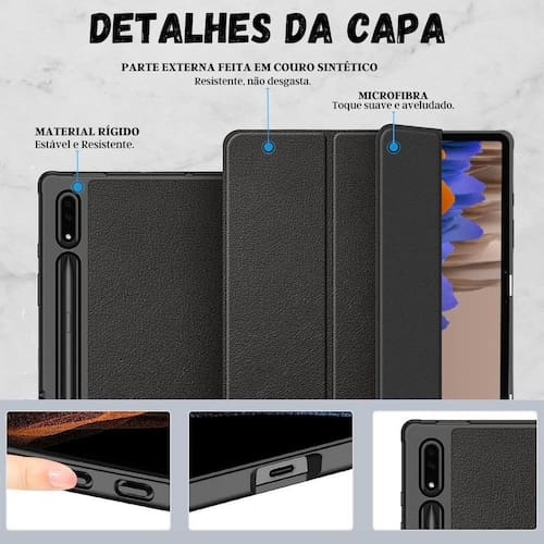 esta capa é projetada com um slot para caneta que permite fácil acesso e armazenamento de sua caneta. Além disso, a textura de silicone na parte externa da capa proporciona uma aderência confortável e segura para segurar seu tablet sem deslizar enquanto carrega. Mantém a aparência elegante do seu dispositivo por mais tempo. Imagine ter sua caneta sempre à mão, sem ter que se preocupar com a possibilidade de perdê-la. Com capa de silicone, você pode ter certeza de que seu tablet está protegido e pronto para ser utilizado em qualquer lugar, a qualquer momento. ------------------ atenção ------------------ compatível com samsung tab s7fe t730 t735 2021 / s8 plus x800 x806 2022 / s7 plus t790 t796 2020 . ------------------ ------------------ posso usar a capa com película r: sim, você pode usar a capa junto com a película sem problema, a case não interfere no uso da película. A capa possui compartimento para guardar a caneta r: sim, a capa possui o slot para a caneta. Quais são os modelos compatíveis r: compatível com samsung tab s7 plus t790 t796 2020 . ------------------ especificações ------------------ comprimento: 28. 5 cm. Largura: 19 cm. Altura: 1cm. Peso: 30g. Material interno: camurça. Material externo: tpu. Compatível com samsung tab s7fe t730 t735 2021 / s8 plus x800 x806 2022 / s7 plus t790 t796 2020 . . ------------------ conteúdo ------------------ 1x capa magnética. 1x película de vidro. 1x kit limpeza. Anúncio referente a case tablet não incluso caneta não inclusa