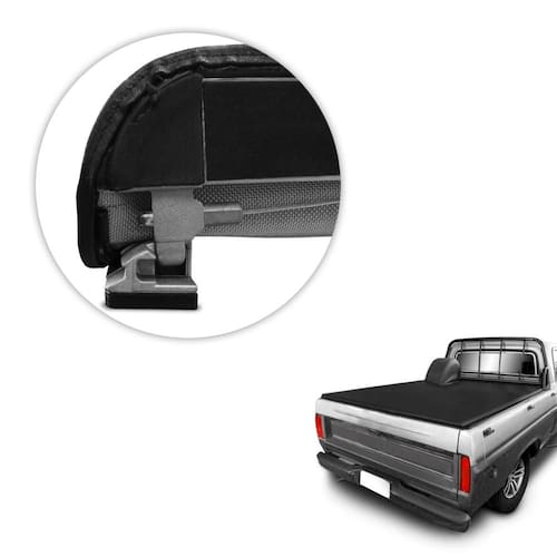 Estrutura e sistema de travas fabricadas em alumínio injetado com encaixe trek, acompanha varetas transversais, mantendo a lona esticada para que não haja acúmulo de água, acabamento debrum de lona em trama de 8x8 e tensores destacáveis para maior praticidade em seu manuseio, além de possuir puxador para facilitar a abertura da capota.