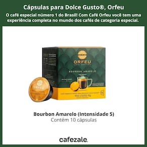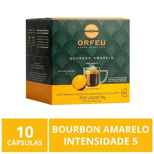 As cápsulas compatíveis com máquinas Dolce Gusto Orfeu, vieram para elevar o nível desta categoria, oferecendo o melhor do Café Orfeu para os usuários destas máquinas.Orfeu, é a marca de café especial número 1 do Brasil. Café Orfeu tem uma diferença importante: todos os processos são feitos dentro das próprias fazendas. Plantam, colhem, torram e embalam. Isso garante total frescor do café. Você perceberá a uniformidade dos grãos e da torra. Perceberá os aromas e sabores característicos. Todos os detalhes que fazem a sua experiência com Orfeu ser marcante.Sobre as Cápsulas de Café Orfeu- Orfeu é a marca de café especial número 1 do Brasil.- As cápsulas funcionam perfeitamente nas cafeteiras Dolce Gusto.- Toda a produção é feita dentro das próprias fazendas, garantindo um café fresco.Conteúdo 1 caixa de 10 cápsulas compatíveis Dolce Gusto. Totalizando 10 cápsulas. SaborBourbon Amarelo Intensidade 5 Orfeu Bourbon Amarelo em cápsulas é um café 100% Arábica, de torra média-clara que apresenta notas cítricas, principalmente de lima e tangerina. Possui corpo baixo, acidez acentuada e aromas e sabores complexos. Sua intensidade é equivalente a 5. E a dosagem indicada para um espresso é de 40ml.Modelos de cafeteiras compatíveis As cápsulas de café Orfeu funcionam em todos os modelos de cafeteiras Dolce Gusto: Circcolo, Esperta, Drop, Fontana, Oblo, Stelia, Piccolo, Mini ME, Jovia, Lumio, Genio II, Genio S e Movenza.Sua máquina Dolce Gusto estará em perfeito estado sempreAtenção: essas cápsulas de chá não funcionam nas cafeteiras Nespresso, Três Corações e Delta Q, pois elas usam outros modelos de cápsulas.Observações - Validade: 12-16 Meses- Fabricado no Brasil Marca de um terceiro não relacionado à Orfeu