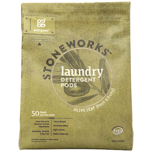 Grab Green Stoneworks – Cápsulas de detergente para roupas, folha de oliva, 50 unidades (pacote com 1) cargas – Certificação EPA Safer Choice, alimentadas por plantas derivadas naturais e cápsulas de pó à base de minerais