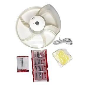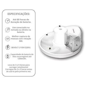 Especificações Técnicas: Marca: NSBAO Modelo: YG-B1 Material: Plástico de alta resistência Acompanha algumas iscas para a mosca Utiliza uma bateria de lithium recarregável de 1200mAH Tensão da carga: 5V usando cabo USB Luz indicador de carga: Carregue a bateria de 2 a 3 horas na 1. Vez que for usar. Leia as instruções na caixa antes de usar. Peso: 550g Cor: Branco