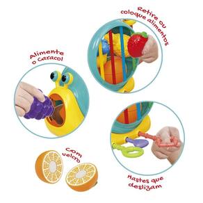 E o melhor: ele tem frutinhas fofas que se dividem com tiras autocolante, prontinhas para serem montadas de novo! Mas as surpresas não param por aí! Tem cordinhas coloridas para passar as frutinhas, e ainda dá para alimentar o caracol.