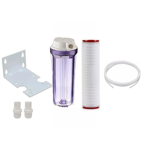 1x carcaça de 10 polegadas transparente rosca 1/4 1x suporte simples para 1 carcaça branco/ zincado 2x conectores reto rosca 1/4 para ligação 2x metros de mangueira branca 1/4 1x refil plissado absoluto 0,22m