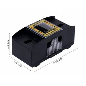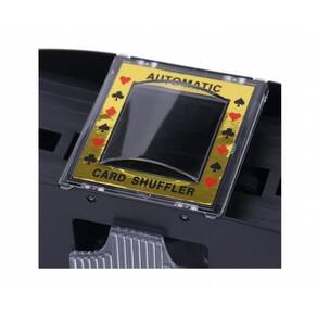DESCRIÇÃO: Misturador de cartões. Ótimo para uso com jogos de cartas, como blackjack ou pôquer. Feito de plástico de alta qualidade. Você pode misturar até 2 capas de uma só vez. Funciona com 4 pilhas AA. (BATERIAS NÃO INCLUÍDAS) Ficha técnica: Marca/Modelo: Importado\ nDimensões/peso\ nProduto: 21 cm x 10 cm x 10 cm\ nDimensões/Peso\ nCaixa: 21 cm x 10 cm x 10 cm\ nCores disponíveis: PRETO.