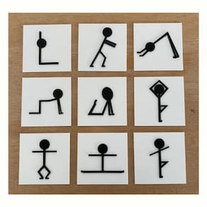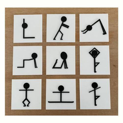 Conteúdo: - 9 peças feitas em acrílico branco com as poses em alto relevo feitas em acrílico preto. Cada peça possui 10x10cm.