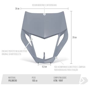 A carenagem do farol é utilizado para proteger o farol contra impactos, arranhões e danos que podem ser causados por pedras e outros objetos, melhorando também a aerodinâmica de sua motocicleta.