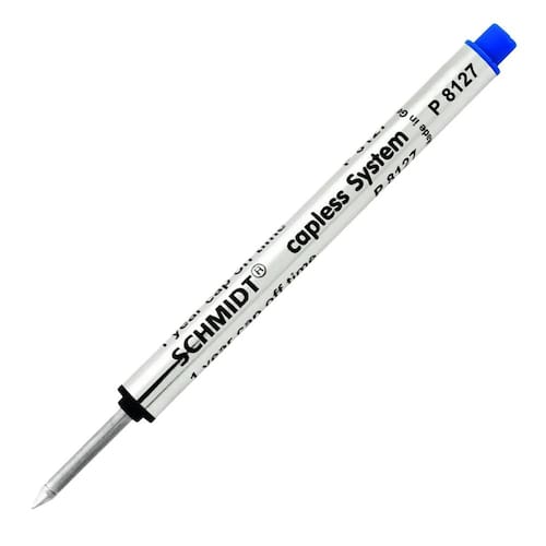 Carga para caneta rollerball Schmidt Short Capless, com escrita média. Compatível com diversos modelos de caneta rollerball sem tampa de marcas como Montegrappa, Omas e Retro 51. Também compatível com as canetas Montblanc Capless, a exemplo do modelo M.