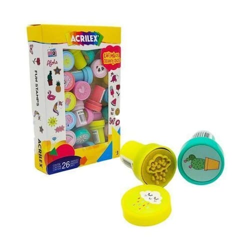 os carimbos divertidos da acrilex são perfeitos para desenvolver sua criatividade e deixar suas anotações mais coloridas com diversos modelos e cores diferentes a cor do carimbo corresponde com a cor da embalagem. Tema: fun aloha