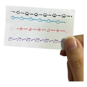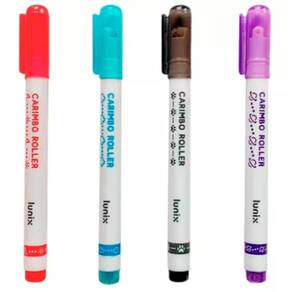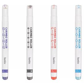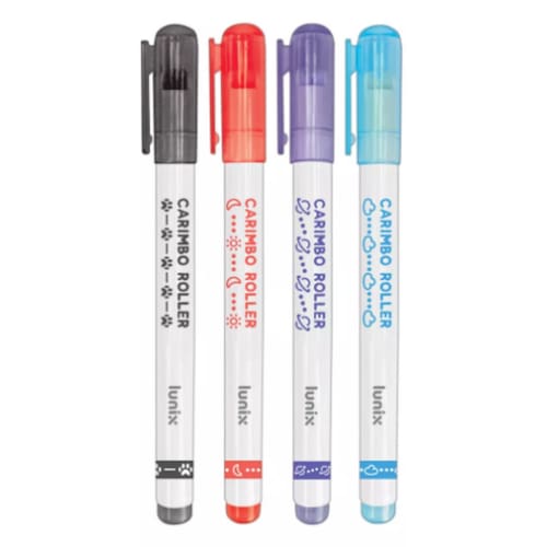 O Carimbo Roller Lunix tem formato de caneta, com tinta à base de água, e as opções de estampas incluem Patinhas pretas, Nuvens azuis, Sol & Lua vermelhos e Planetas roxos.