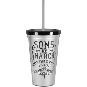 - O copo de plástico prateado apresenta o logotipo da SOA e o texto “Motorcycle Club”