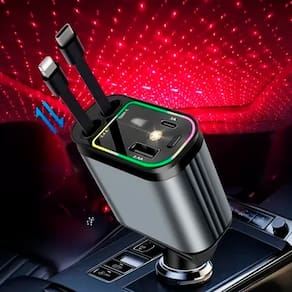 Carregador veicular inteligente de 66W com 2 cabos retráteis (USB-C e Lightning) e 2 portas adicionais (USB-C e USB-A). Carrega até 4 dispositivos simultaneamente. Compatível com veículos 12V e 24V. Possui projetor de luz ambiente integrado, plugue ajustável em 180°, proteção contra sobrecarga e curto-circuito.Tipo