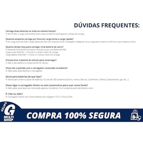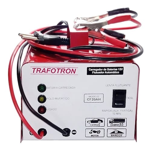permite que pessoas sem conhecimento nenhum de carregadores possam usar o produto, simplesmente conectando as garras à bateria e acionando o botão carga lenta ou rápida. Não precisando desligar a bateria do veículo. Carrega baterias de 1,5 até 300 ampéres