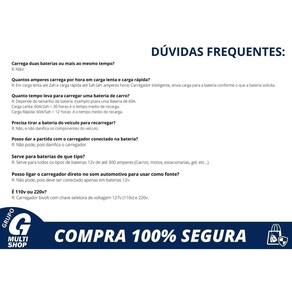 permite que pessoas sem conhecimento nenhum de carregadores possam usar o produto, simplesmente conectando as garras à bateria e acionando o botão carga lenta ou rápida. Não precisa retirar a bateria do veículo. Carrega baterias de 1,5 até 300 ampéres. Carrega até 2ah em carga lenta;