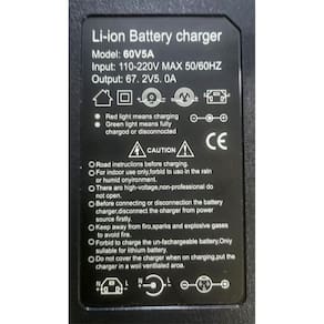 Carregador de bateria de lítio para bicicleta elétrica e scooter. Entrada bivolt automático (110/220V). Saída de 67.2V com 5.0A (5000mA). Possui luzes indicadoras de status de carregamento (vermelha: carregando, verde: carregado/desconectado). Inclui cooler para ventilação. Proteção contra uso em locais úmidos. Não abrir sem ser profissional. Desconectar da energia antes de conectar/desconectar a bateria. Armazenar em local ventilado e longe de fontes de ignição.Tipo