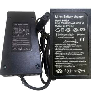 Carregador de bateria de lítio para bicicleta elétrica e scooter. Entrada bivolt automático (110/220V). Saída de 67.2V com 5.0A (5000mA). Possui luzes indicadoras de status de carregamento (vermelha: carregando, verde: carregado/desconectado). Inclui cooler para ventilação. Proteção contra uso em locais úmidos. Não abrir sem ser profissional. Desconectar da energia antes de conectar/desconectar a bateria. Armazenar em local ventilado e longe de fontes de ignição.Tipo