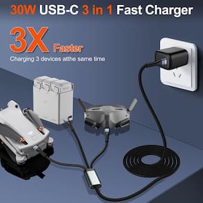 Carregador rápido 3 em 1 USB-C 30W PD para drones DJI Mini 4 Pro, Mini 4K, Mini 3 Pro/Mini 3, Mini 2 SE, Avata, Avata 2, Air 3, Air 2S, carregador de parede tipo C para acessórios de drones DJI - 1,5 m - ? ? ? ? ? Este é um cabo de conexão 3 em 1 USB C para 3 * Tipo C com o mais recente chip de derivação inteligente que suporta dispositivos de forma inteligente e ajusta automaticamente a energia, o que é obviamente uma escolha mais segura e conveniente! Suporta carregamento de até 3 dispositivos ao mesmo tempo para economizar tempo! O cabo de carregamento rápido USB C para 3 x tipo C tem duas portas com potência diferente: saída separada USB C para USB C (PD60W máx.), USB C para USB C (máximo de 15W), USB C para USB C (máximo de 15 W). - Cabo USB 3 em 1 de 30W especialmente projetado para todos os dispositivos DJI e acessórios com porta de carregamento tipo C, como DJI neo, mini 4 pro, mini 3 pro, mini 3, mini 2, mini 2 se, air 3, air 2s, fpv, avata, mavic 3 drones, RC 2, RC, RC-N2, RC-N3, RC-N1, Motions 2, Motion, controle remoto FPV e acessórios de bateria; também compatível com óculos DJI Integra, óculos 2, óculos V2 e DJI estabilizadores osmo, câmeras de ação de bolso, etc. - ? : utiliza o chip GaN líder do setor para melhor potência e desempenho. Proteção automática contra sobretensão, sobrecarga, superaquecimento, curto-circuito, este chip inteligente pode corresponder à velocidade máxima de carregamento exigida pelo dispositivo DJI. PD 3.0 (porta USB-C): 5 V, 3A, 9 V, 3A, 15 V, 2 A, 20 V, 1,5 A (até 30 W) - Cabo de carregamento rápido 3 em 1, manga de alumínio + malha de algodão prolonga a vida útil do cabo de dados. para evitar emaranhados e danos. O invólucro de alumínio é mais resistente e resistente ao calor, garantindo uma longa vida útil. Pode suportar mais de 9.000 inserções e dobras. [Observação]: Este cabo de carregador USB C de 60 W para 3 * tipo C é projetado apenas para carregamento, não suporta transferência de dados. - & : 1 ano de garantia, se você não estiver completamente satisfeito com o kit de carregador dentro de 30 dias após a compra, teremos o prazer de reembolsá-lo por qualquer motivo. Um carregador de 30 W, um cabo de carregamento 3 em 1 C para C de 1,2 m